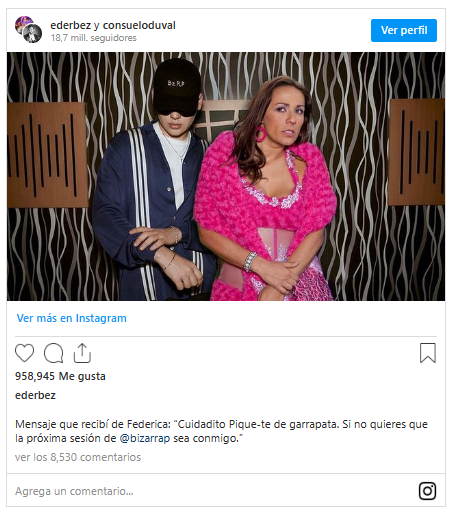 “Mensaje que recibí de Federica: ‘Cuidadito, pique-te de garrapata. Sino quieres que la próxima sesión de Bizarrap sea conmigo’”, es lo que escribió Eugenio Derbez junto a la fotografía con la que la cantante y el compositor promocionaron la colaboración juntos, pero en esta ocasión con Federica en el lugar de Shakira.