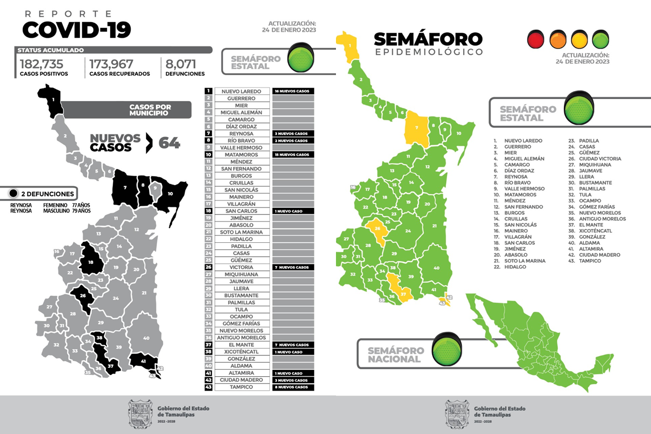 Ciudad Victoria, Tamaulipas. Enero 24 de 2023- En el reporte diario de casos de COVID-19, el secretario de salud, Vicente Joel Hernández Navarro, informó que Tamaulipas cerró la jornada de este martes con 64 pacientes positivos y 2 fallecimientos, debido a que presentaron complicaciones de la enfermedad.