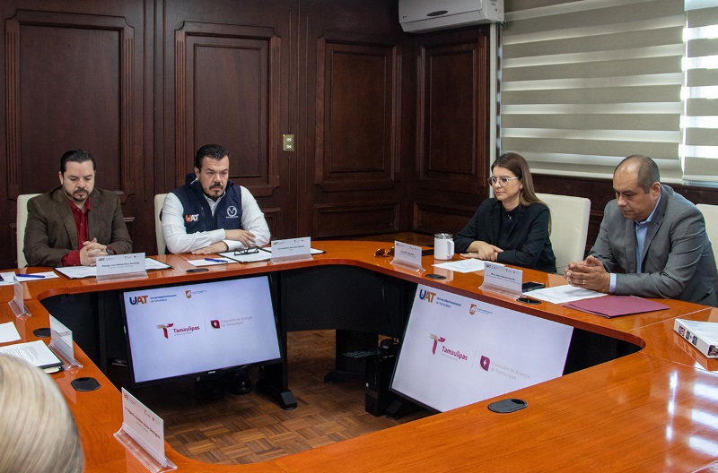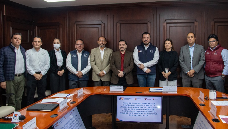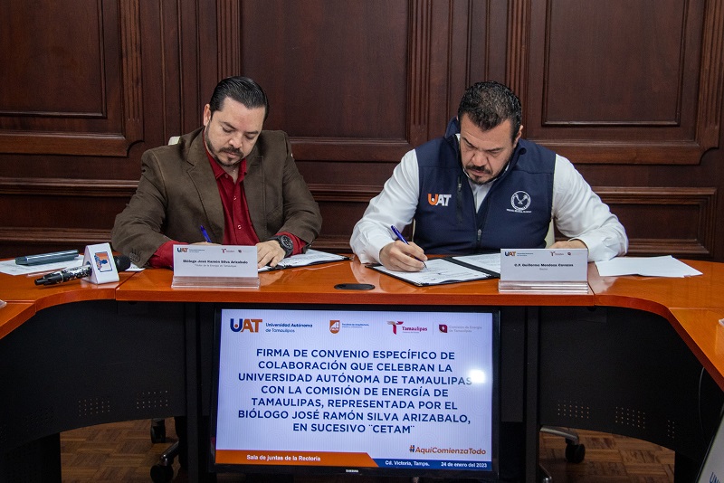Ciudad Victoria, Tamaulipas; 24 de enero de 2023. La Universidad Autónoma de Tamaulipas (UAT) y la Comisión de Energía de Tamaulipas (CETAM) celebraron la firma de un convenio de colaboración específica en el que unen esfuerzos para aprovechar el potencial energético de la entidad, mediante el desarrollo de investigación, tecnologías y conocimientos que contribuyan en aportar beneficios directos a la sociedad.