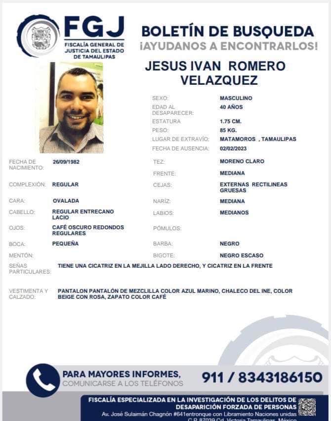 La persona no localizada responde al nombre de Jesús Iván Romero Velázquez, de 40 años de edad y su reporte es el 2 de febrero de este año en la colonia Treviño Zapata en la ciudad de Matámoros.