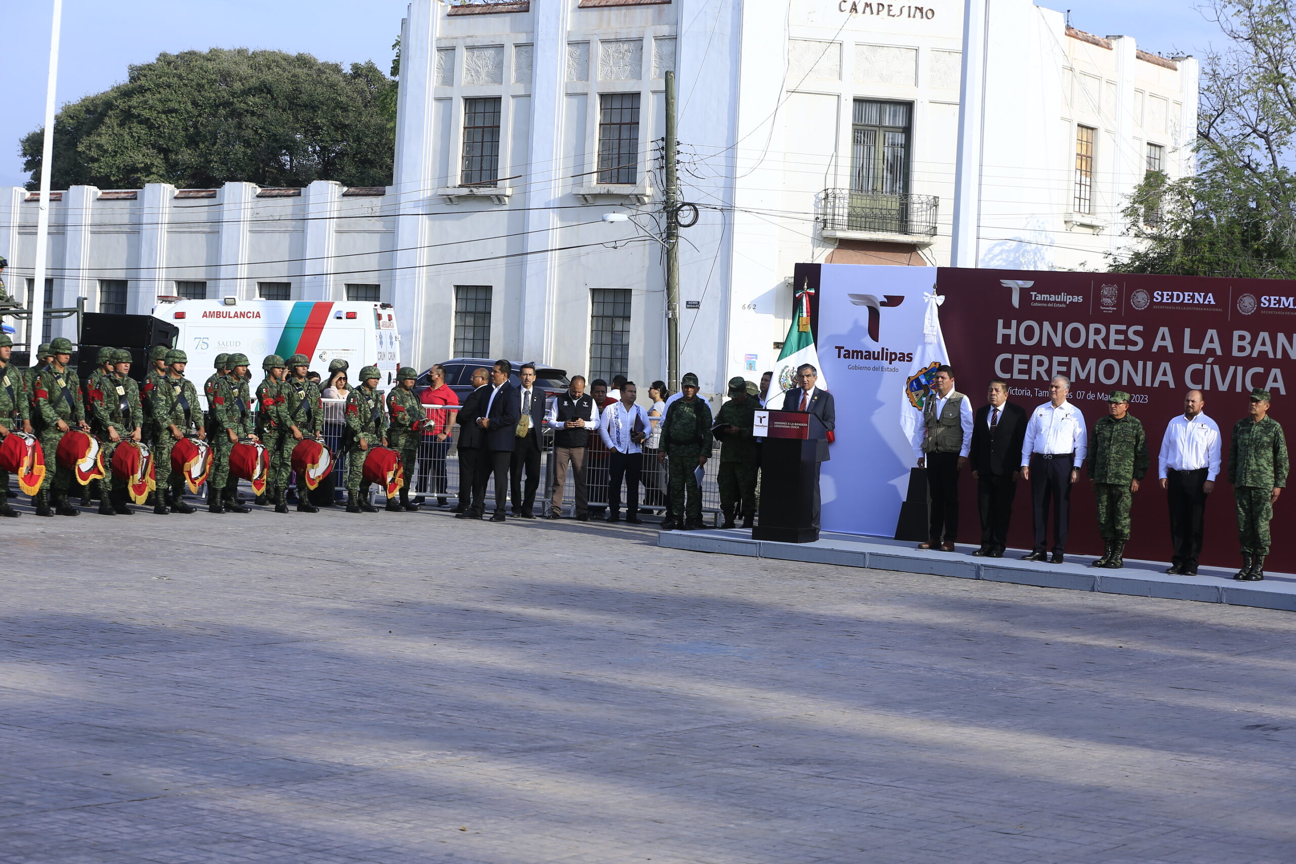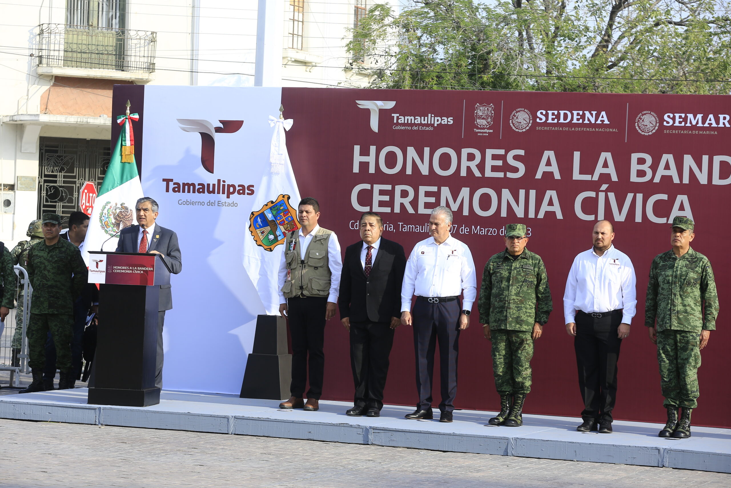 Acompañaron al gobernador en el presídium, el general de división DEM Norberto Cortéz Rodríguez, comandante de la Cuarta Región Militar; vicealmirante Gabriel González Contreras, comandante de la Primera Región Naval; Héctor Joel Villegas González, secretario general de Gobierno; Lucía Aimé Castillo Pastor, secretaria de Educación en Tamaulipas; general de brigada DEM Elpidio Canales Rosas, comandante de la 48 Zona Militar y Vicente Joel Hernández Navarro, secretario de Salud.