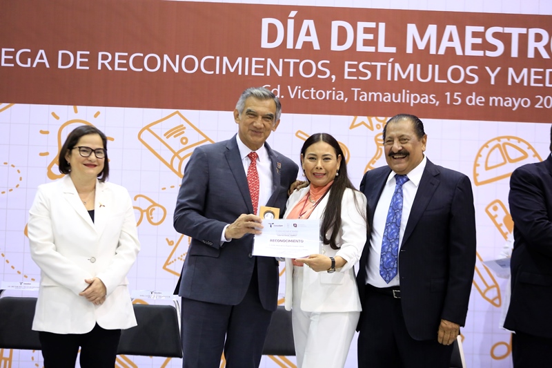 La ceremonia que se prolongó durante cinco horas, permitió al gobernador Américo Villarreal entregar personalmente a cada uno de los galardonados su reconocimiento y estímulo; la presea al mérito docente “Maestro Ignacio Manuel Altamirano” por 40 años de servicio y “ Maestro Rafael Ramírez” por 30 años de entrega y trayectoria dedicados a la noble vocación de enseñar.