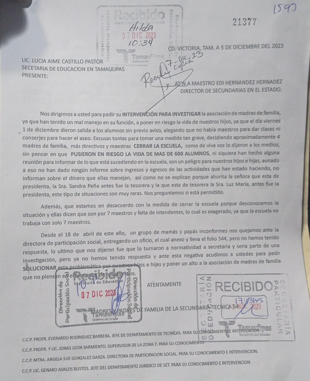 CD.VICTORIA, Tamaulipas.- Siguen los conflictos en la Esc. Sec. Tec. 54, donde maestros inconformes denuncian al Director de una serie de atropellos en contra de los afectados, el cual es protegido por el líder Sindical Arnulfo Rodríguez, quien tiene a un pariente dentro de este conflicto, protegiéndolas a como dé lugar a pesar que se les han comprobado las acusaciones.
