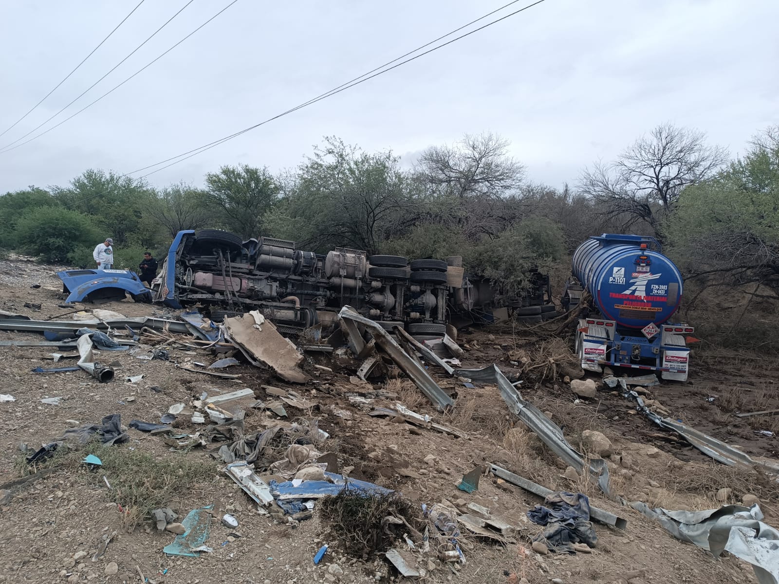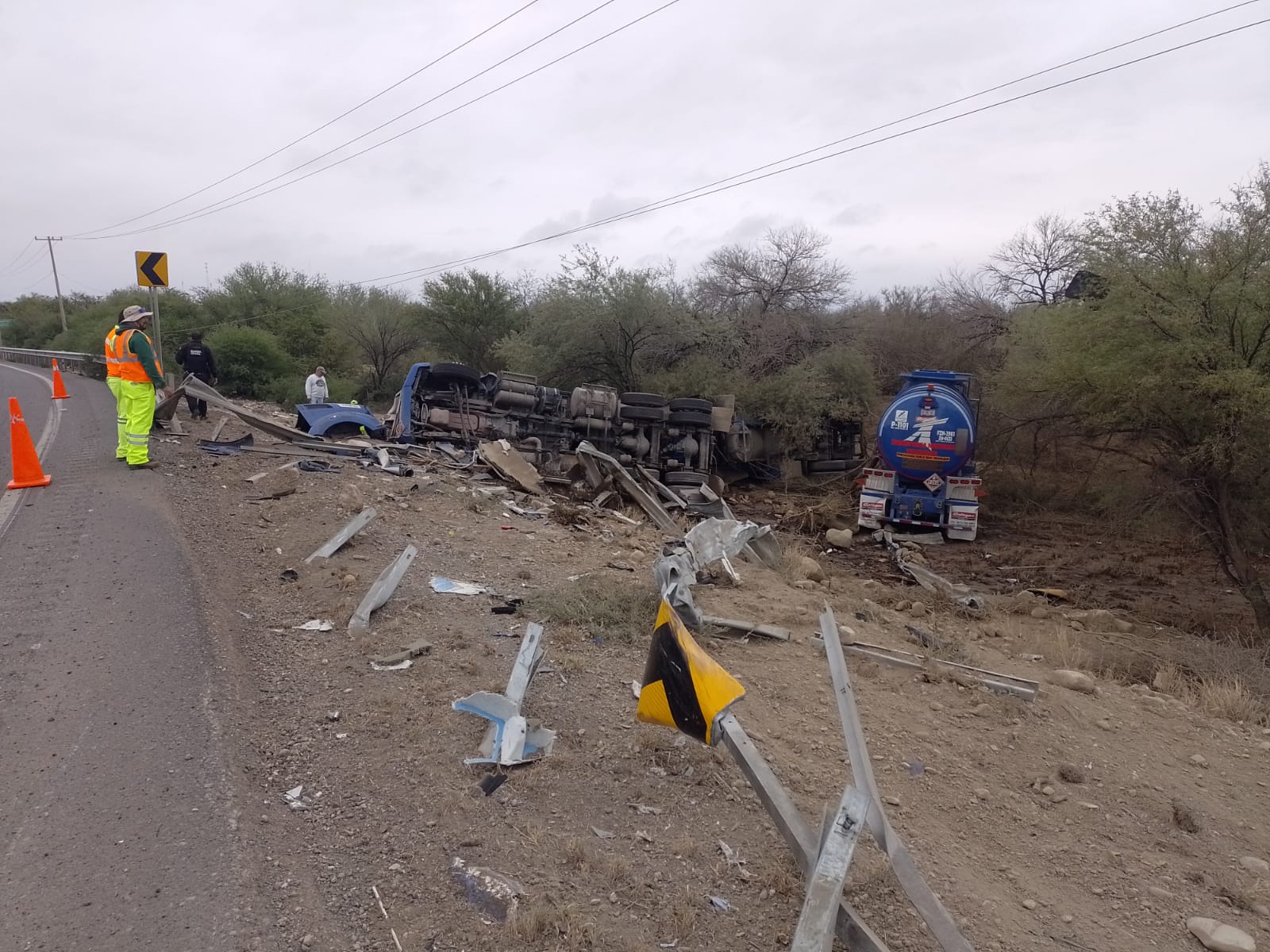 Llera, Tamaulipas.- Una pipa que transportaba diésel se impactó contra la barra de contención y se volcó al circular sobre el kilómetro 01 de la Carretera Federal 83.