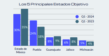 Por su parte, Puebla registró 24% de los delitos a nivel nacional, con una variación de 6% al alza con respecto a 2023. A estas entidades le siguen Guanajuato (8%), Jalisco (6%) y Michoacán (5%).