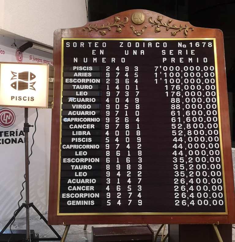 El premio correspondió al Sorteo Zodiaco número 1678, alusivo al Día Nacional de la Manzana Mexicana, y los resultados se dieron a conocer en el Salón de Sorteos del Edificio Edison de la Lotería Nacional, el domingo 20 de octubre a las 20:00 horas