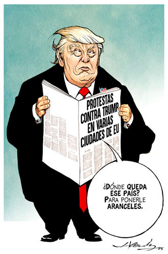 Cientos de personas también se manifestaron en Palm Beach Gardens, Florida, a pocos kilómetros del campo de golf de Trump en Jupiter, Florida, donde el magnate pasó la mañana del sábado 5 en el Campeonato del Club Senior. La vocera informó que Trump ganó su partido de segunda ronda de dicho torneo y avanzó a la Ronda de Campeonato. Como puede observarse, el plutócrata que ahora hasta biblias, cachuchas y tenis Trump vende en los actos presidenciales, como sucedió en la toma de posesión, está en lo suyo. https://www.jornada.com.mx/2025/04/06/cartones/1