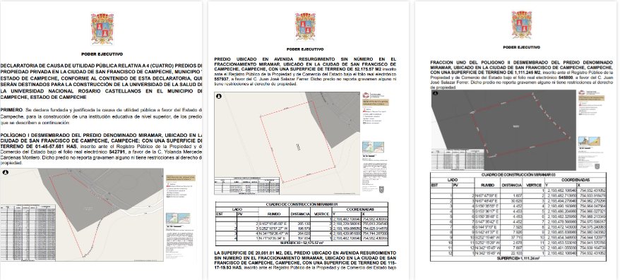 En la Sección Administrativa del Diario Oficial se establece la “Declaratoria de causas de utilidad pública de cuatro predios de propiedad privada en la ciudad de San Francisco Campeche (…) que serán destinados para la construcción de la Universidad de la Salud de la Universidad Nacional Rosario Castellanos”.