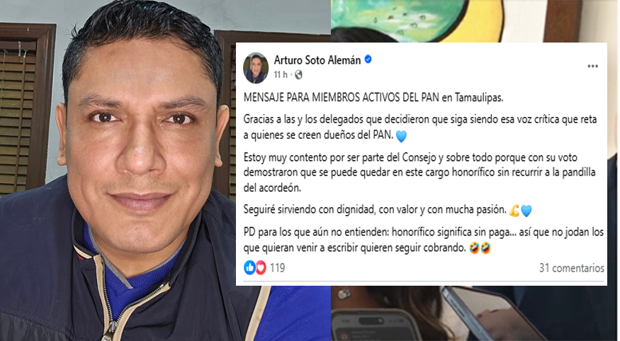 Ciudad Victoria, Tamaulipas.– El panista Arturo Soto Alemán volvió a encender las redes y la conversación interna del Partido Acción Nacional en Tamaulipas, luego de publicar un mensaje dirigido a los militantes activos del blanquiazul, en el que lanzó fuertes indirectas contra quienes —según sus palabras— “se creen dueños del PAN”.