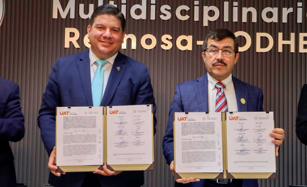 Reynosa, Tam.; 6 de octubre de 2025..-El rector de la Universidad Autónoma de Tamaulipas (UAT), Dámaso Anaya Alvarado, y el presidente del Instituto Mexicano de Contadores Públicos (IMCP), Héctor Amaya Estrella, firmaron un Convenio Marco de Colaboración que impulsará proyectos conjuntos orientados a fortalecer la formación de las y los futuros profesionales de la contaduría.