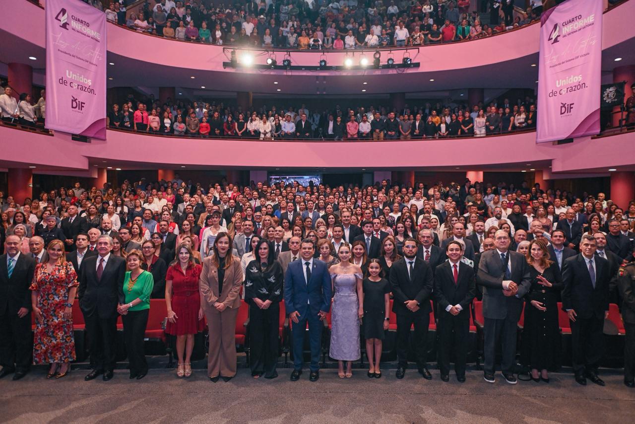 Cd. Victoria, Tam.; 29 de octubre de 2025. – Con un mensaje lleno de emoción y compromiso, la presidenta del Sistema DIF Victoria, Lucy de Gattás, presentó su cuarto informe de actividades, acompañada de su esposo, el alcalde Eduardo Gattás Báez, y de autoridades de los tres niveles de gobierno, representantes del sector empresarial, social y educativo.