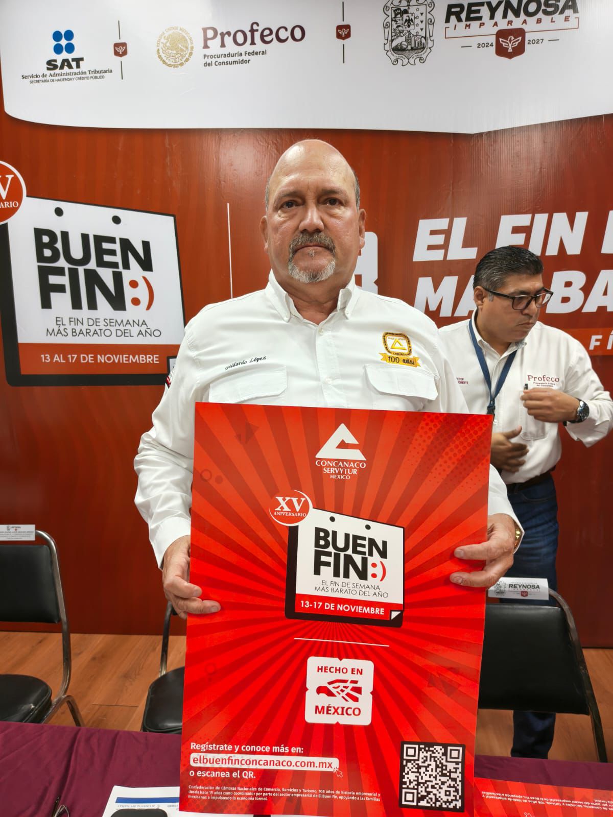 Gildardo López Hinojosa, presidente de la CANACO Reynosa, informó que la edición 2025 del Buen Fin se llevará a cabo del 13 al 17 de noviembre, coincidiendo con el megapuente por la conmemoración de la Revolución Mexicana, lo que se espera impulse significativamente el consumo en todo el país.