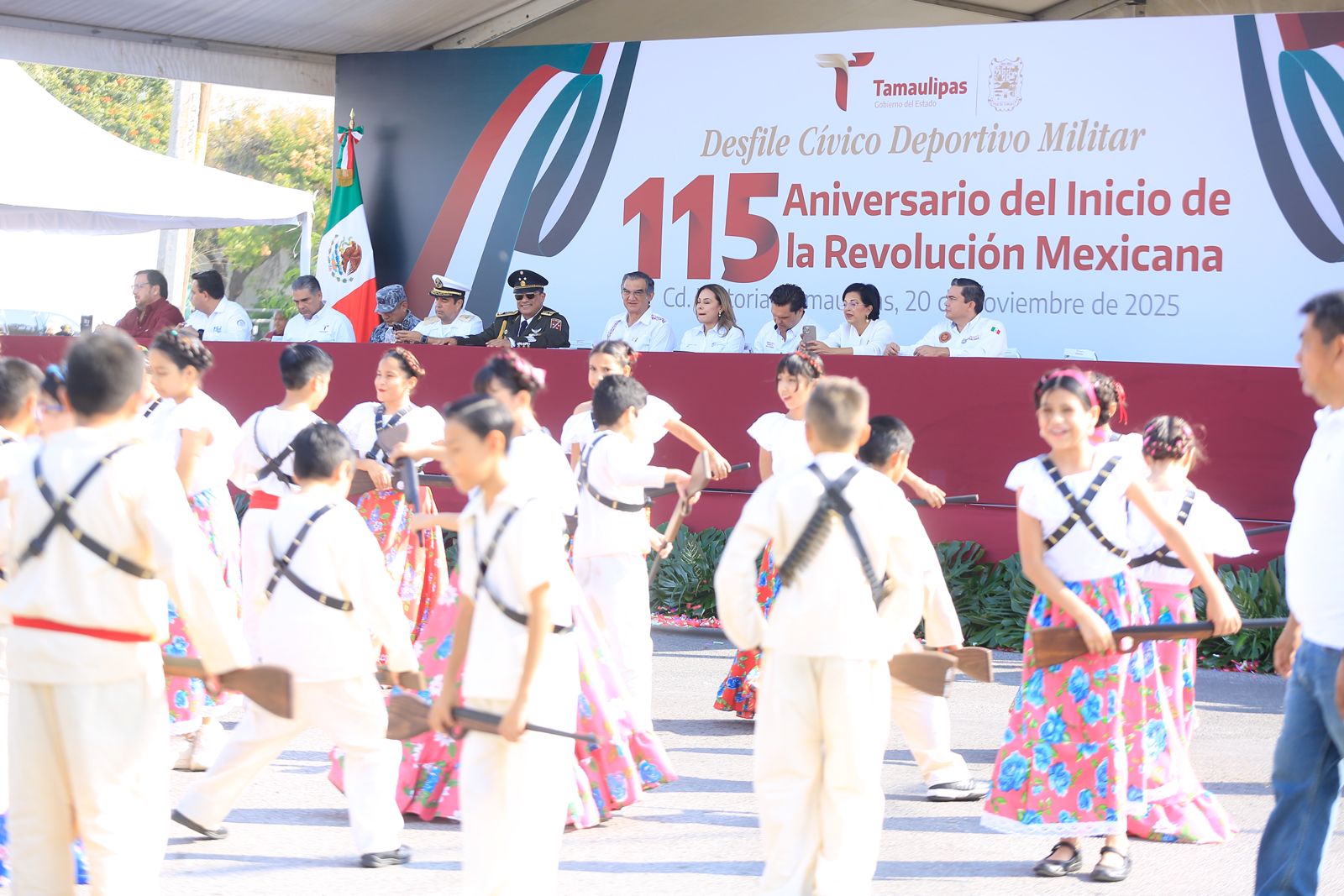 -Presidida por el gobernador Américo Villarreal, la fiesta cívica transcurre en paz, con la participación de más de 3,500 estudiantes, militares y elementos de seguridad