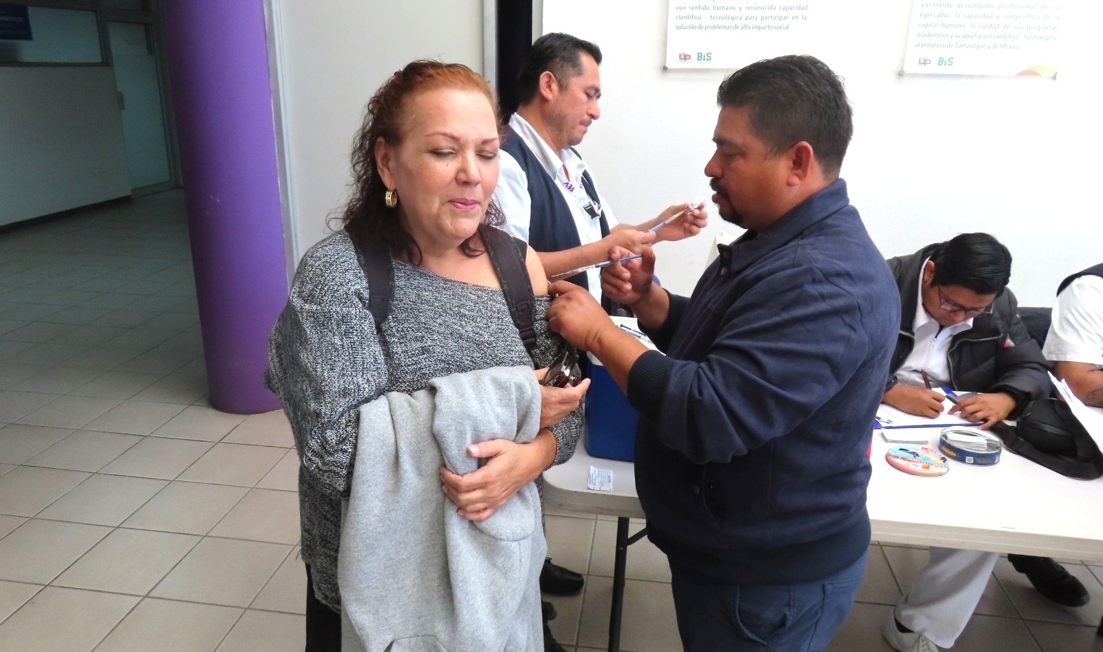 Personal de la Jurisdicción Sanitaria No. 1 de la Secretaría de Salud del Gobierno de Tamaulipas acudió a esta institución educativa para aplicar alrededor de 200 dosis a la comunidad escolar contra las enfermedades de tétanos, neumonía, influenza y hepatitis B.