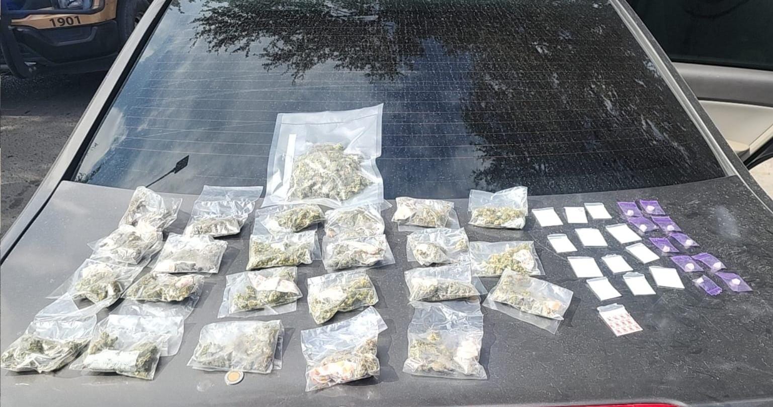 Tras la intervención, los elementos de seguridad aseguraron 23 bolsitas transparentes con hierba verde y seca con características similares a la marihuana, una bolsa tipo ziploc de mayor tamaño con la misma sustancia, 13 bolsitas con polvo blanco con características similares a la cocaína y 10 bolsitas con piedras cristalinas, presuntamente crack.