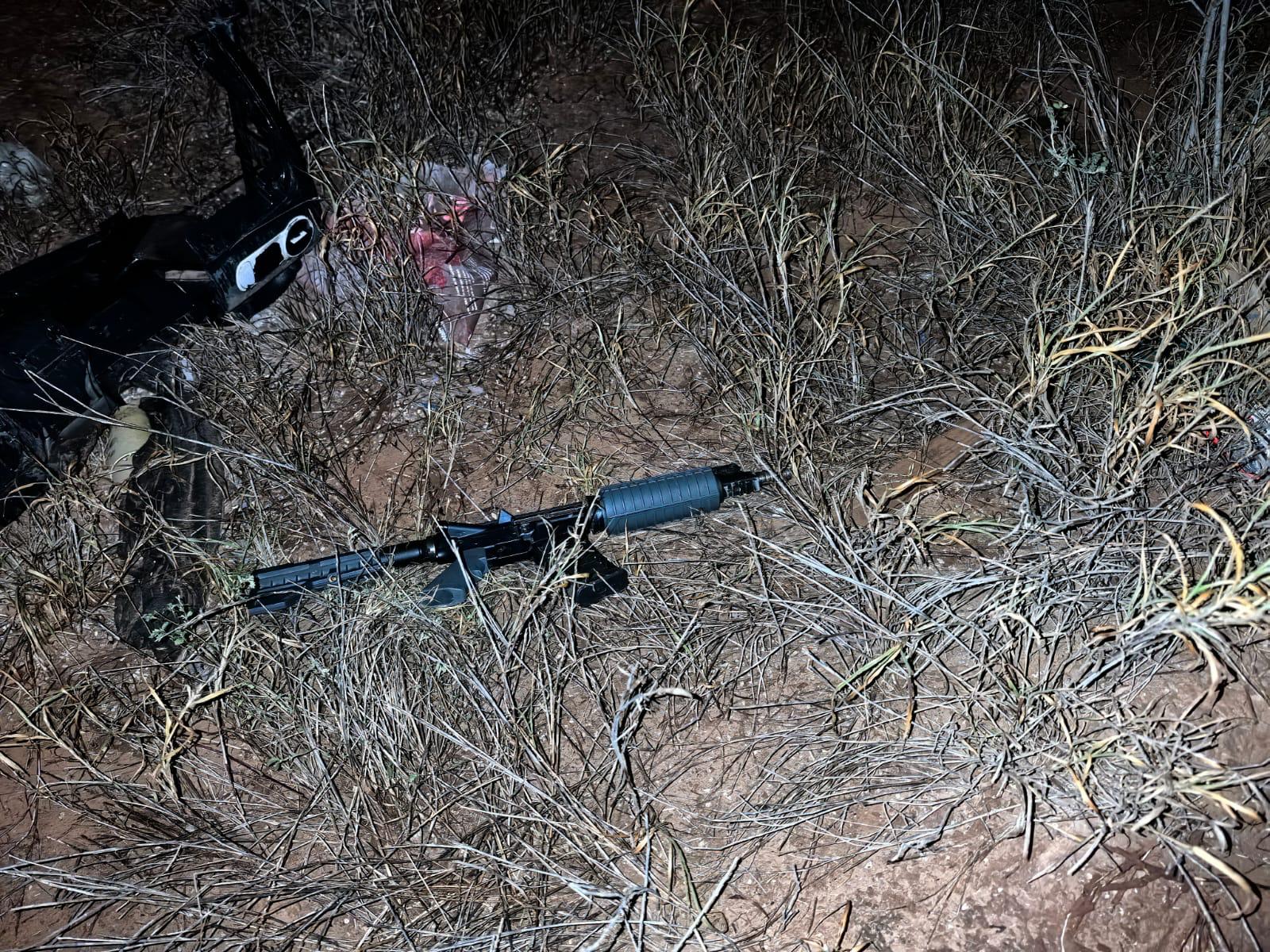 A escasos diez metros del vehículo, fue asegurada un arma larga modelo KY AM-15 Multi Cal, la cual contaba con un cargador abastecido con cuatro cartuchos calibre 9 milímetros, lo que refuerza la presunción de actividades ilícitas.