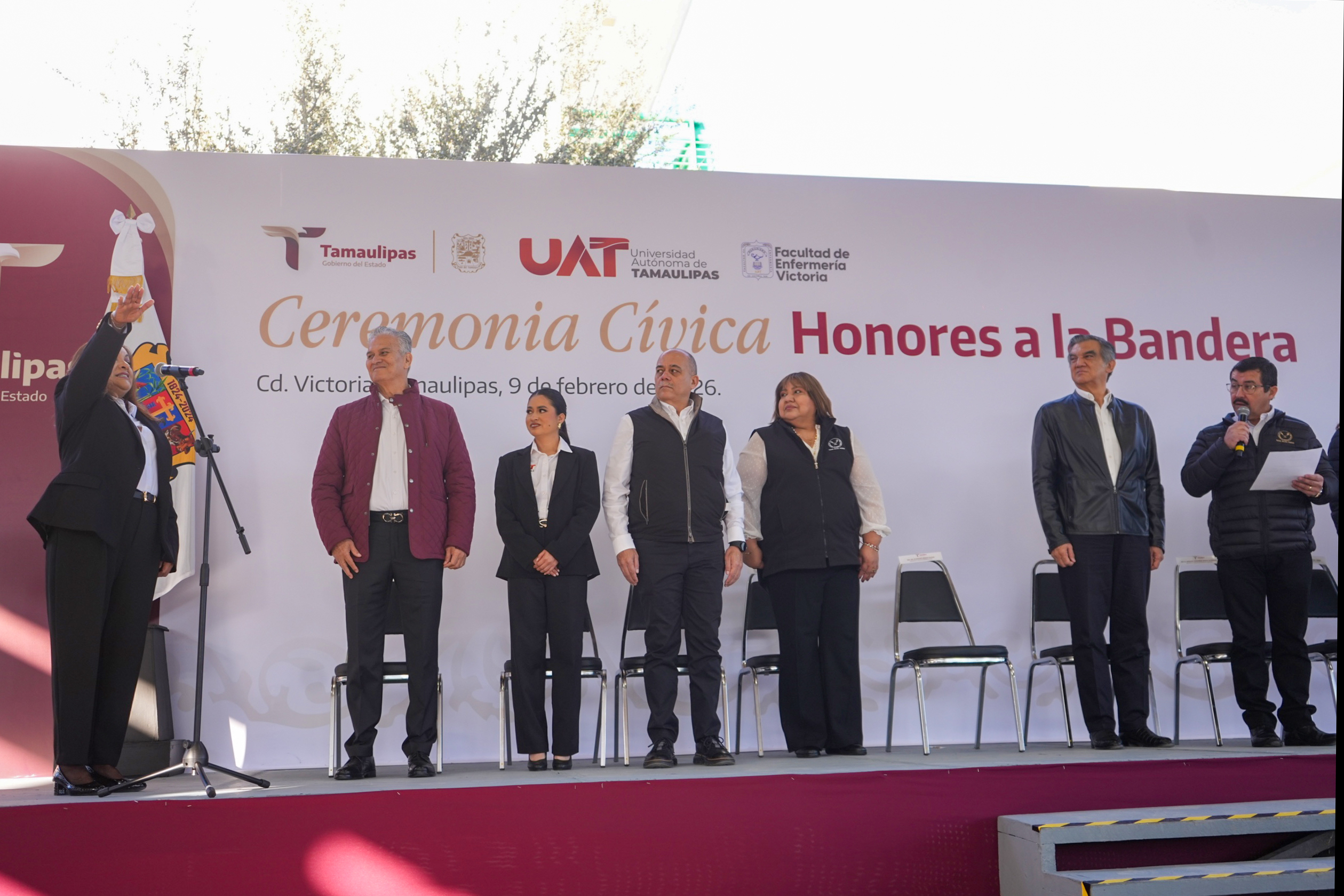 Ciudad Victoria, Tam.; 9 de febrero de 2026..-El gobernador Américo Villarreal Anaya, junto con el rector de la Universidad Autónoma de Tamaulipas (UAT), Dámaso Anaya Alvarado, encabezó este lunes la ceremonia de honores a la bandera y atestiguó la toma de protesta de la Dra. María Guadalupe Vázquez Salazar como directora de la Facultad de Enfermería Victoria para el periodo 2026-2029.